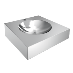 Einzelwaschtisch, für Wandmontage, Chromnickelstahl, Oberfläche seidenmatt, Materialstärke 1,2 mm, fugenlos eingeschweisstes Rundbecken, Waschtisch aus einem Stück tiefgezogen, quadratische Form, für Rollstuhlbenutzer geeignet gemäß DIN 18040-1, abgerundete Kanten mit Beckenprägung, mit Armaturenbank 75 mm (T), mit Armaturenbohrung 32 mm (D), ohne Überlauf, Ablauf mittig, mit fugenlos eingeschweisstem Siebventil G 1 1/4 B und Abgangsrohr DN 32, Unterputzsiphon bauseits, Waschtisch unten geschlossen mit Revisionsklappe, integrierte Konsolen für Montage mit Stichmass 280 mm gemäß EN 31, inklusive Befestigungsmaterial. Abmessungen 500 x 105/160 x 500 mm (B x H x T) Muldenmaße 350 x 81 mm (D x H)