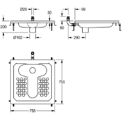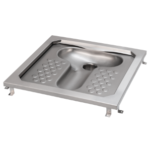 Hock-WC, aus Chromnickelstahl, Oberfläche seidenmatt, Materialstärke 1 mm, passend für Wandeinbau-Druckspüler DN 20, Wasserspülmenge 9 Liter, mit umlaufender Abkantung (22 mm) und umlaufenden Spülrand. Anschluss hinten senkrecht mit Verschraubung Durchmesser 28 mm, Abgang innen senkrecht DN 100, inklusive Befestigungsmaterial und Höhennivellierung. Abmessungen 755 x 200 x 755 mm (B x H x T)