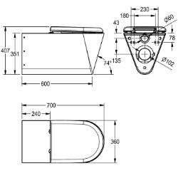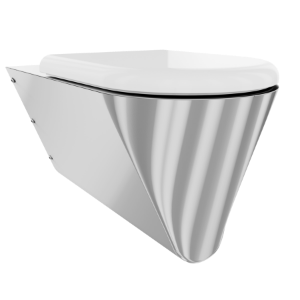 Behindertengerechtes wandhängendes Tiefspül-WC, Chromnickelstahl, Materialstärke 1,5 mm, sichtbare Flächen seidenmatt, Spülverhalten nach EN 997 zertifiziert, Wasserspülmenge mindestens 4 Liter, Abgang hinten waagrecht mit Geruchsverschluss in Edelstahl DN 100, Sitzfläche mit nach innen abfallender Prägung, mit weißem WC-Sitz, allseits gerundet, vandalensicher, Montage mit inkludierter Montageplatte nach EN 33, mit diebstahlsicherer Verschraubung. Abmessungen 360 x 407 x 700 mm (B x H x T)