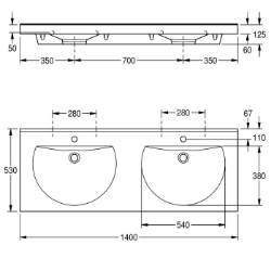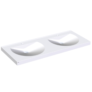 RONDA Doppelwaschtisch aus kunstharzgebundenem Mineralwerkstoff MIRANIT, mit porenfreier, glatter Oberfläche (temperaturbeständig bis 80 °C), Farbton Alpinweiß. Mit zwei nahtlos eingeformten, runden Mulden, ohne Überlauf. Befestigung an Beckenrückwand. Hintere Schwallkante. Dreiseitige Schürze 60 mm (H). Mit Armaturenbohrungen 35 mm (D), inklusive Befestigungsmaterial. Abmessungen 1400 x 125 x 530 mm (B x H x T) Muldenmaße 540 x 90 x 380 mm (B x H x T)