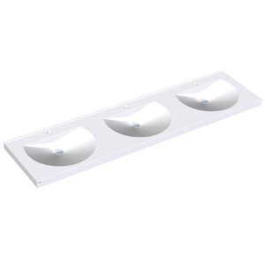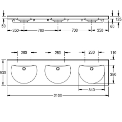 RONDA Reihenwaschtisch aus kunstharzgebundenem Mineralwerkstoff MIRANIT, mit porenfreier, glatter Oberfläche (temperaturbeständig bis 80 °C), Farbton Alpinweiß. Mit drei nahtlos eingeformten, runden Mulden, ohne Überlauf. Befestigung an Beckenrückwand. Hintere Schwallkante. Dreiseitige Schürze 60 mm (H). Ohne Armaturenbohrungen, inklusive Befestigungsmaterial. Abmessungen 2100 x 125 x 530 mm (B x H x T) Muldenmaße 540 x 90 x 380 mm (B x H x T)