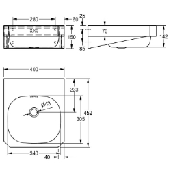 Einzelwaschtisch, für Wandmontage, Chromnickelstahl, Oberfläche seidenmatt, fugenlos eingeschweisstes Becken, Becken poliert, rechte ckige Waschtischform, mit Armaturenbank 120 mm (T), ohne Armaturenbohrung, mit Überlauf, Stopfenab- und Überlaufgarnitur G 1 1/4 B, Ablauf hinten mittig, Frontschürze links und rechts unter 45° abgeschrägt, mit eingeschweissten Wandkonsolen, Befestigung laut EN 31. Inklusive Schrauben und Dübel. Abmessungen 400 x 150 x 452 mm (B x H x T) Muldenmaße 340 x 140 x 300 mm (B x H x T)