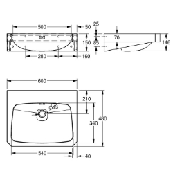 Einzelwaschtisch, für Wandmontage, Chromnickelstahl, Oberfläche seidenmatt, Materialstärke 1,0 mm, fugenlos eingeschweisstes Becken, Becken poliert, rechteckige Waschtischform, Armaturenbank 90 mm (T), mit Überlauf, G 1 1/4 B Stopfensieb, Ablauf hinten mittig, Frontpaneel mit 45° Ecken, mit eingeschweissten Wandkonsolen, Abstand zwischen den Achsen der Befestigungslöcher laut EN 31, inklusive Schrauben und Dübel. Abmessungen 600 x 150 x 480 mm (B x H x T) Muldenmaße 550 x 350 x 145 mm (B x H x T)