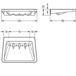 Seifenablage, für Aufputzmontage, Chromnickelstahl, Oberfläche seidenmatt, Materialstärke 1,0 mm, tiefgezogene Seifenschale, mit Was serablauf, inklusive Edelstahlschrauben und Dübel. Abmessungen 125 x 22 x 90 mm (B x H x T)