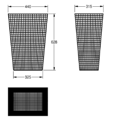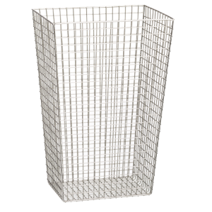 Abfallbehälter, freistehend oder zur Wandmontage, Chromnickelstahl, Drahtstärke 2 mm, viereckiger Lochmantel, Fassungsvermögen 61 l, inklusive Aufhängehaken und Befestigungsmaterial. Abmessungen 440 x 628 x 315 mm (B x H x T)