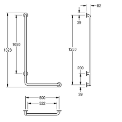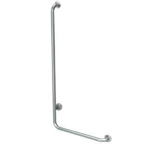 Winkelgriff 90° für Aufputzmontage, Chromnickelstahl, Oberfläche seidenmatt, Schliff mit rutschhemmender Wirkung, Rohrdurchmesser 32 mm, Materialstärke 1,2 mm, Wandabstand 82 mm, geprüft und zertifiziert (LGA), mit drei Edelstahl Rosetten für verdeckte Montage, inklusive Edelstahlschrauben und Dübel. Ausführung rechts Abmessungen 678 x 1328 x 82 mm (B x H x T)