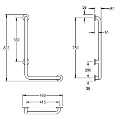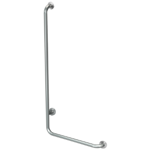 Winkelgriff 90° für Aufputzmontage, Chromnickelstahl, Oberfläche seidenmatt, Schliff mit rutschhemmender Wirkung, Rohrdurchmesser 32 mm, Wandstärke 1,2 mm, Wandabstand 82 mm, geprüft und zertifiziert (LGA), mit drei Edelstahl Rosetten für verdeckte Montage, inklusive Edelstahlschrauben und Dübel. Ausführung rechts Abmessungen 493 x 828 x 82 mm (B x H x T)