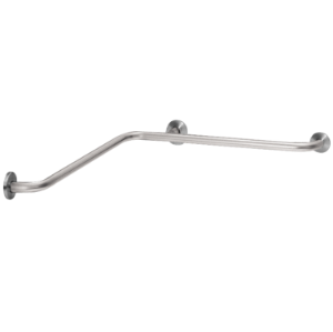 Wandhandlauf für Ecken mit waagrechter Stangenführung, für Aufputzmontage, Chromnickelstahl, Oberfläche seidenmatt, Schliff mit rutschhemmender Wirkung, Rohrdurchmesser 32 mm, Wandstärke 1,2 mm, Wandabstand 82 mm, geprüft und zertifiziert (LGA), mit drei Edelstahl Rosetten für verdeckte Montage, inklusive Edelstahlschrauben und Dübel. Befestigung nur für Beton-Mauerwerk geeignet. Abmessungen 726 x 78 x 726 mm (B x H x T)