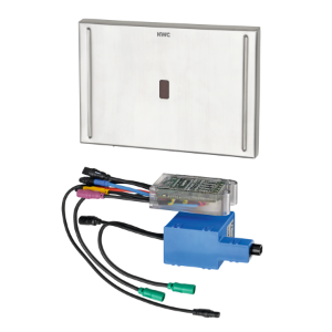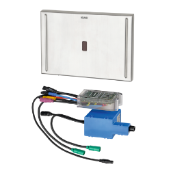 EXOS - A3000 open berührungslos, opto-elektronisch gesteuerte WC-Steuerung für Wandeinbauspülkasten, mit Möglichkeit der externen St euerung, wie Armatureneinstellung und Kommunikation über ECC-Funktionscontroller oder optionaler bidirektionaler Fernbedienung. Mit wasserdichtem Elektronikmodul mit zusätzlichem Eingang für bauseits zu stellende Sensoren (z.B. Taster an Stützgriffen), maximale Entfernung zum Elektronikmodul 5 m, Stellmotoreinheit, zwei wasserdichte Elektro-T-Verteiler zum Anschluss an Systemkabel, Halterahmen und Edelstahlabdeckplatte mit integriertem Sensor und verdeckter Schraubbefestigung. Aktivierte Hygienespülung 24 Stunden nach letzter Betätigung und Speicherung von Statistikdaten. Separate Spannungsversorgung 24 V DC über AQUA 3000 open Systemzubehör.