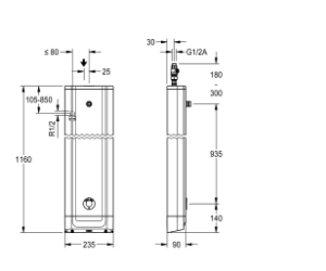 F5E-Duschpaneel aus Edelstahl für Aufputzmontage mit Durchgangsventil und Anschlussstutzen für Duschkopf. Elektronisch gesteuert, zum Anschluss an vorgemischtes Warmwasser oder Kaltwasser. Anschlussstutzen für separat notwendigen KWC-Duschkopf DN 15 mit vormontiertem Durchflussmengenregler 9,0 l/min. Gehäuse aus Edelstahl mit erhabener Funktionsfläche und Abdeckkappen aus Kunststoff. Mit Magnetventil und Tast-Sensor inklusive Steuerelektronik mit Start/Stopp-Funktion und Reinigungsabschaltung. Anschlussschlauch mit absperrbarer Wassermengenregulierung und Sieb. Aktivierte Hygienespülung 24 Stunden nach letzter Betätigung und Speicherung von Statistikdaten. Mit Möglichkeit der Parametrierung und Kommunikation über optionale bidirektionale Fernbedienung. Wahlweise für Batteriebetrieb mit 6 V Lithium Batterie (CR-P2) je Armatur oder separate Spannungsversorgung über Netzteil 6,75 V / 12 V DC oder AQUA 3000 open Systemzubehör. Gehäuseabmessung 235 x 1160 x 90 mm (B x H x T) Duschkopf sowie Batteriefach inklusive Batterie oder Netzteil zuzüglich Verlängerungskabel müssen separat bestellt werden.