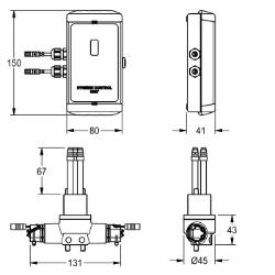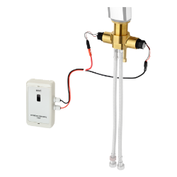 Hygieneeinheit für F5L Einhebelmischer, Ausladung 125 mm, zur Durchführung einer automatischen Hygienespülung und programmgesteuerten thermischen Desinfektion. Funktionsblock mit 2 Magnetventilkartuschen und elektronischer Steuereinheit im Gehäuse aus Kunststoff zur Aufputzmontage, für Batterie- oder Netzbetrieb, 6 V DC. Aktivierte Hygienespülung, fixe Intervallzeit 24 Stunden und Speicherung von Statistikdaten. Mit Möglichkeit der Parametrierung und Kommunikation über optionale bidirektionale Fernbedienung.