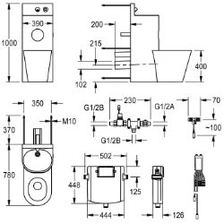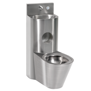 WC-Waschtischkombination, zur Aufstellung vor einem von hinten zugänglichem Technikraum, Chromnickelstahl, Oberfläche seidenmatt, mit fernbetätigt gesteuerten Armaturenkomponenten, zur Montage im Technikraum, Befestigung von hinten mit Gewindestangen. Standsäule, Materialstärke 2,0 mm, mit hochgezogener Rückwand inklusive Wandauslauf und Piezo-Taster mit Start/Stopp-Funktion, mit fugenlos eingeschweißtem WC-Papierrollenfach und fugenlos eingeformter Waschmulde, mit Siphon, Abgang DN 40. Tiefspül-WC, Materialstärke 1,6 mm, mit bodenlanger Schürze, Anordnung mittig 90°; Spülrand gegen Verbergen von Gegenständen geschützt, mit Piezo-Taster für WC-Spülung, Spülverhalten nach EN 997 zertifiziert, Abgang hinten waagerecht DN 100. Mit Magnetventil zum Anschluss an vorgemischtes Warmwasser oder Kaltwasser. Wandeinbauspülkasten, mit Motor mit Einmengenspültechnik (9 oder 6 l), schwitzwasserisoliert. Anschlussspannung 24 V DC. Inklusive Befestigungsmaterial. Gesamtabmessungen 390 x 1000 x 775 mm (B x H x T) WC Position Mitte