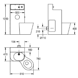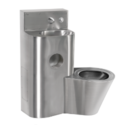 WC-Waschtischkombination, zur Aufstellung vor der Wand, Chromnickelstahl, Oberfläche seidenmatt, nicht sichtbare Befestigung mit Stockschrauben, verschließbare Revisionsöffnung. Standsäule, Materialstärke 2,0 mm, mit hochgezogener Rückwand inklusive Wandauslauf und Druckknopfbetätigung, fugenlos eingeschweißtem WC-Papierrollenfach und fugenlos eingeformter ovaler Waschmulde mit Siphon aus Kunststoff. Tiefspül-WC, Materialstärke 1,6 mm, mit bodenlanger Schürze, Anordnung rechts 45°, Spülrand gegen Verbergen von Gegenständen geschützt, Spülverhalten nach EN 997 zertifiziert, Abgang hinten waagerecht DN 100. Selbstschluss-Durchgangsventil mit Fernbetätigung, zum Anschluss an vorgemischtes Warmwasser oder Kaltwasser, selbsttätig und rückschlagfrei schließend. Wandeinbauspülkasten, schwitzwasserisoliert, mit Einmengenspültechnik (9 oder 6 l). Inklusive Befestigungsmaterial. Gesamtabmessungen 809 x 1050 x 779 mm (B x H x T) WC Position rechts
