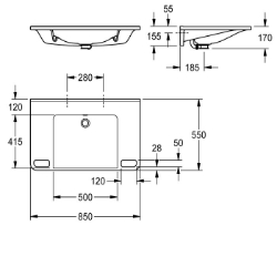 MEDCARE Einzelwaschtisch aus kunstharzgebundenem Mineralwerkstoff MIRANIT, mit porenfreier, glatter Oberfläche (temperaturbeständig bis 80 °C), Farbton Alpinweiß. Unterfahrbar, mit integrierten Haltegriffen, Ablageflächen, nahtlos eingeformter Mulde und Überlauf, ohne Armaturenbohrung. Befestigung an Beckenrückwand. Hintere Schwallkante, inklusive Befestigungsmaterial. Abmessungen 850 x 150 x 550 mm (B x H x T) Muldenmaße 500 x 117 x 415 mm (B x H x T)