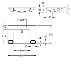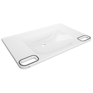 MEDCARE Einzelwaschtisch aus kunstharzgebundenem Mineralwerkstoff MIRANIT, mit porenfreier, glatter Oberfläche (temperaturbeständig bis 80 °C), Farbton Alpinweiß. Unterfahrbar, mit integrierten Haltegriffen, umrandet mit Farbstreifen in Basaltgrau. Mit Ablageflächen, nahtlos eingeformter Mulde, ohne Überlauf, ohne Armaturenbohrung. Befestigung an Beckenrückwand. Hintere Schwallkante, inklusive Befestigungsmaterial. Abmessungen 850 x 150 x 550 mm (B x H x T) Muldenmaße 500 x 117 x 415 mm (B x H x T)