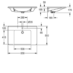 MEDCARE Einzelwaschtisch aus kunstharzgebundenem Mineralwerkstoff MIRANIT, mit porenfreier, glatter Oberfläche (temperaturbeständig bis 80 °C), Farbton Alpinweiß. Unterfahrbar, mit Ablageflächen, nahtlos eingeformter Mulde, Überlauf und Armaturenbohrung 35 mm (D). Befestigung an Beckenrückwand. Hintere Schwallkante, inklusive Befestigungsmaterial. Abmessungen 850 x 150 x 550 mm (B x H x T) Muldenmaße 500 x 117 x 415 mm (B x H x T)