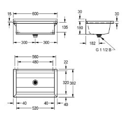 PLANOX fugenlos verschweißte Waschrinne für Wandmontage, Chromnickelstahl, Oberfläche seidenmatt, Materialstärke Waschrinne 0,8 mm / Seitenpaneele 1,2 mm, Seitenpaneele mit integrierten Wandkonsolen, ohne Armaturenbank, ohne Überlauf, 40 mm Wandzarge, Ablauf mittig, Siebventil G 1 1/2 B, inklusive Befestigungsmaterial. Ab einer Länge von 1800 mm ist eine zusätzliche Konsole im Lieferumfang enthalten. Sonderlängen auf Anfrage möglich. Abmessungen 600 x 210 x 382 mm (B x H x T)