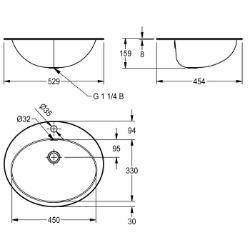 Ovalbecken, montierbar als Einlegebecken oder Unterbaubecken, Chromnickelstahl, Oberfläche innen und außen seidenmatt, Materialstärke 1,0 mm, mit Überlauf, inklusive Ab- und Überlaufgarnitur G 1 1/4 B, ohne Flach- und Stopfensieb, mit Armaturenbank 94 mm (T), mit Armaturenbohrung 35 mm (D), inklusive Edelstahlbügel für Einbau von unten. Abmessungen 529 x 159 x 454 mm (B x H x T) Beckenabmessungen 450 x 159 x 330 mm (B x H x T) Einbau von oben Ausschnitt 511 x 436 mm (B x T) Einbau von unten Ausschnitt 440 x 320 mm (B x T)