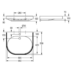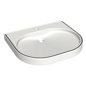 VARIUScare Einzelwaschtisch aus kunstharzgebundenem Mineralwerkstoff MIRANIT, Farbton Alpinweiß mit Farbstreifen (RAL 7022). Unterfahrbar, mit integriertem Griffrand. Mit nahtlos eingeformter Mulde ohne Überlauf. Mit Armaturenbohrung 35 mm (D). Befestigung an Beckenrückwand. Hintere Schwallkante, inklusive Befestigungsmaterial. Abmessungen 650 x 120 x 550 mm (B x H x T) Muldenmaße 600 x 80 x 420 mm (B x H x T)