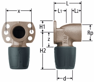 | Rp | d | z | L | L1 | L2 | H1 | H2 | x | ζ | Grösse | Art.-Nr. | VE | suissetec |
